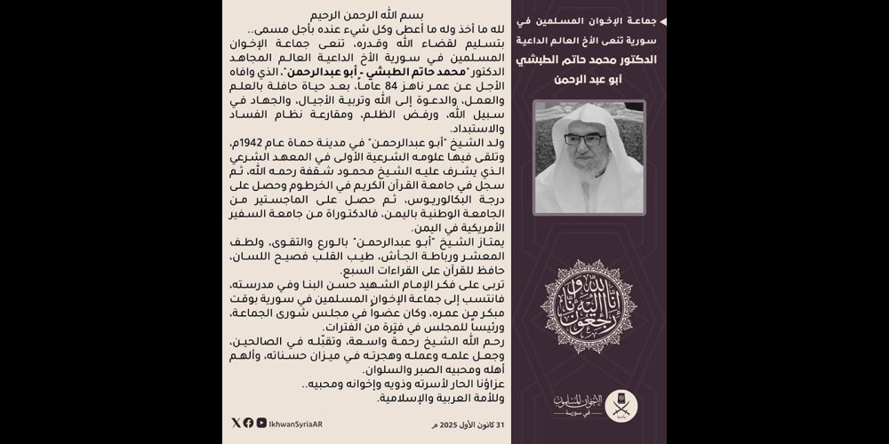 جماعة الإخوان المسلمين في سورية تنعى الأخ الداعية الشيخ علي محمد بكرو