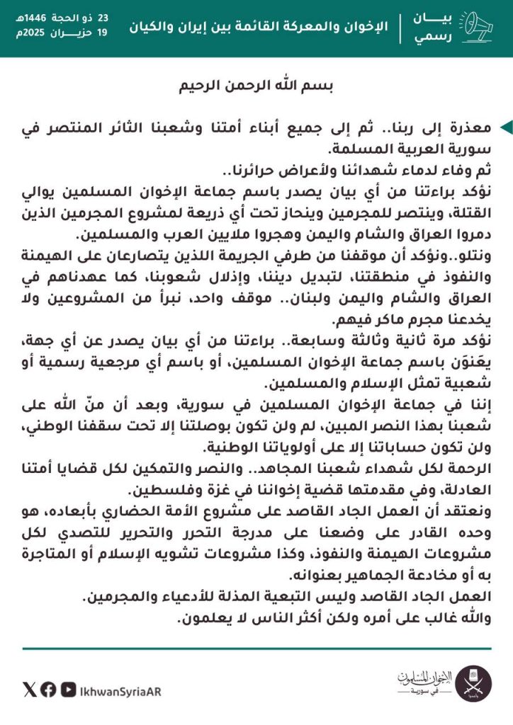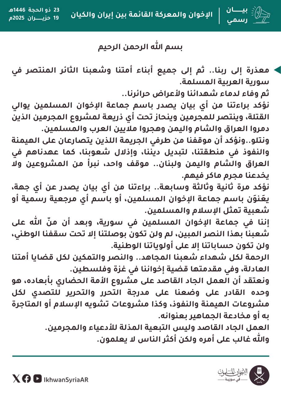 نؤكد براءتنا من أي بيان يصدر باسم جماعة الإخوان المسلمين يوالي القتلة، وينتصر للمجرمين وينحاز تحت أي ذريعة لمشروع المجرمين الذين دمروا العراق والشام واليمن وهجروا ملايين العرب والمسلمين.