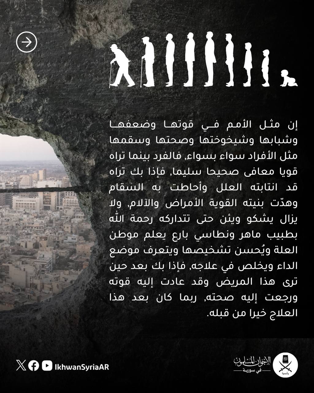 إنّ مثل الأمم في قوتها وضعفها وشبابها وشيخوختها وصحتها وسقمها، مثل الأفراد سواءً بسواء، فالفرد بينما تراه قوياً معافىً صحيحاً سليماً، فإذا بك تراه قد انتابته العلل وأحاطت به السقام وهدّت بنيته القوية الأمراض والآلام، ولا يزال يشكو ويئنّ حتى تتداركه رحمة الله بطبيب ماهرٍ ونطاسيٍّ بارعٍ يعلم مواطن العلّة ويُحسن تشخيصها ويتعرف موضع الداء ويخلص في علاجه، فإذا بك بعد حين ترى هذا المريض وقد عادت إليه قوته ورجعت إليه صحته، ربما كان بعد هذا العلاج خيراً من قبله.