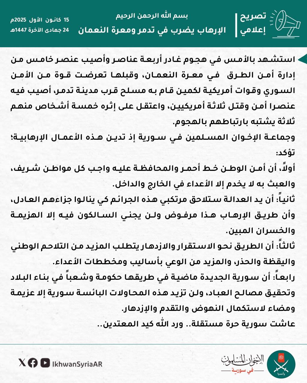 وجماعة الإخوان المسلمين في سورية إذ تدين هذه الأعمال الإرهابية؛ تؤكد: