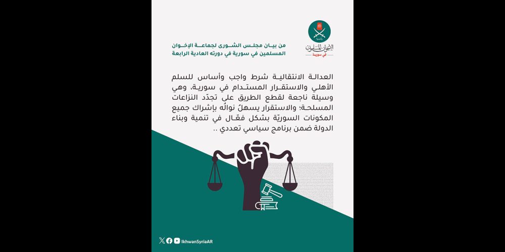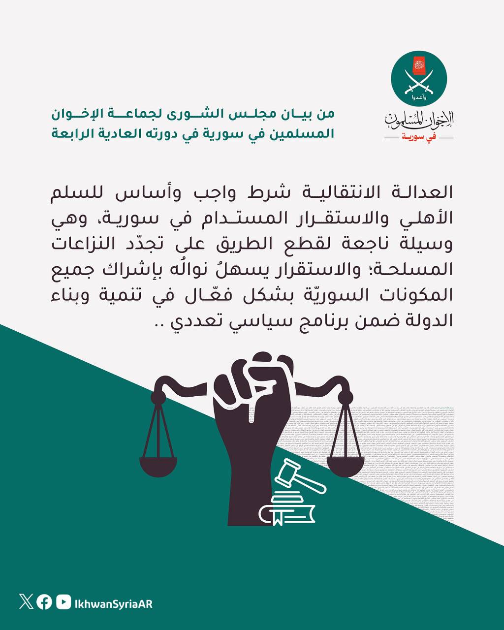 يؤكّد المجلس أنّ العدالة الانتقالية شرط واجب وأساس للسلم الأهلي والاستقرار المستدام في سورية، وهي وسيلة ناجعة لقطع الطريق على تجدّد النزاعات المسلحة؛ كما يؤكّد بالوقت نفسه رؤيته، أن الاستقرار يسهلُ نوالُه بإشراك جميع المكونات السوريّة بشكل فعّال في تنمية وبناء الدولة ضمن برنامج سياسي تعددي، وأنّ استشعار الأطراف السوريّة اليوم واطمئنانها أنّ الدولة – بعد المرحلة الانتقاليّة – تُبنى على أسُسٍ تشاركيّة تمثيليّة، وانتخابات نيابيّة تعدديّة حرّة، عاملٌ هامٌ في تثبيت الاستقرار.