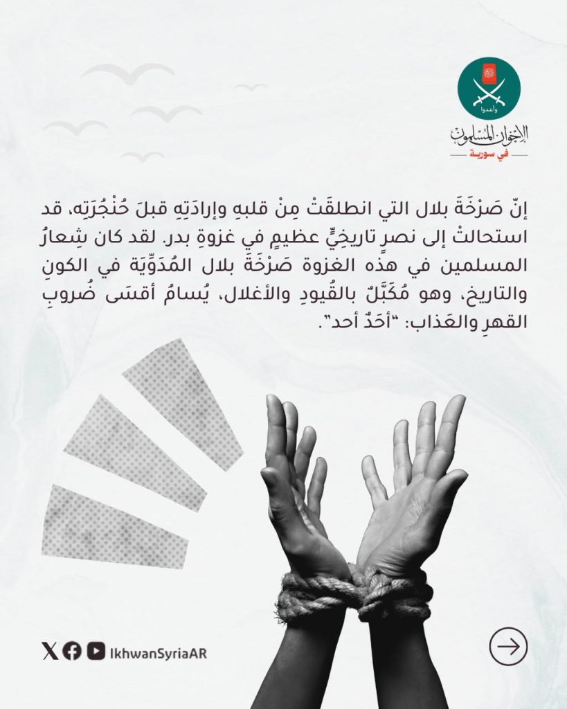 إنّ صَرْخَةَ بلال التي انطلقَتْ مِنْ قلبهِ وإرادَتِهِ قبلَ حُنْجُرَتِه، قد استحالتْ إلى نصرٍ تاريخِيٍّ عظيمٍ في غزوةِ بدر.