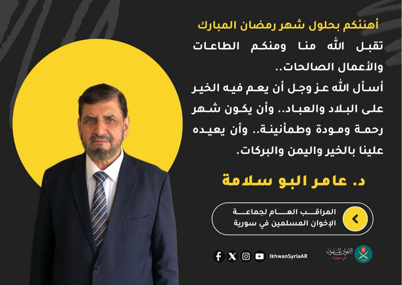 تهنئة فضيلة المراقب العام لإخوان سورية د. “عامر البو سلامة” بمناسبة حلول شهر رمضان المبارك