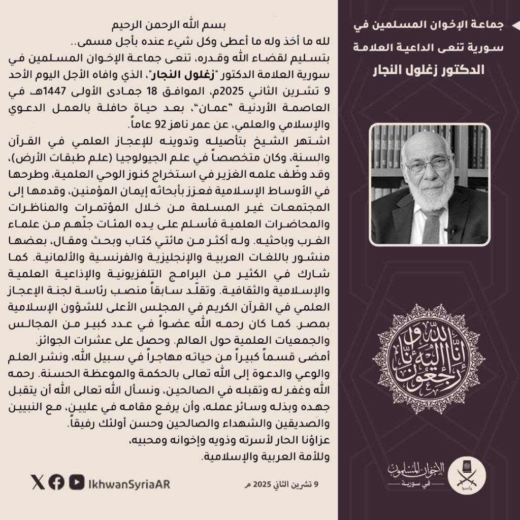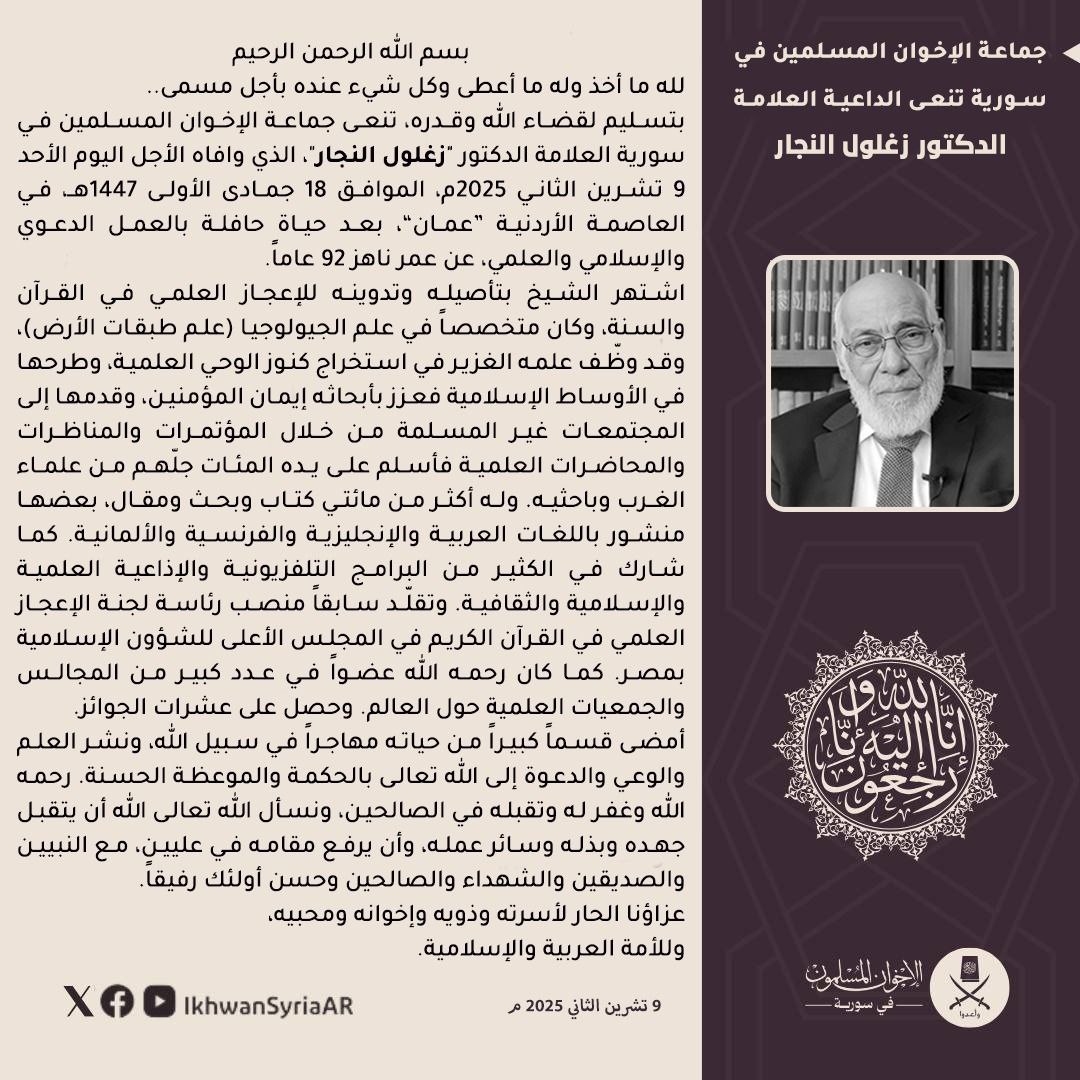 بتسليم لقضاء الله وقدره، تنعى جماعة الإخوان المسلمين في سورية العلامة الدكتور “زغلول النجار”، الذي وافاه الأجل اليوم الأحد 9 تشرين الثاني 2025م، الموافق 18 جمادى الأولى 1447هـ، في العاصمة الأردنية “عمان”، بعد حياة حافلة بالعمل الدعوي والإسلامي والعلمي، عن عمر ناهز 92 عاماً.