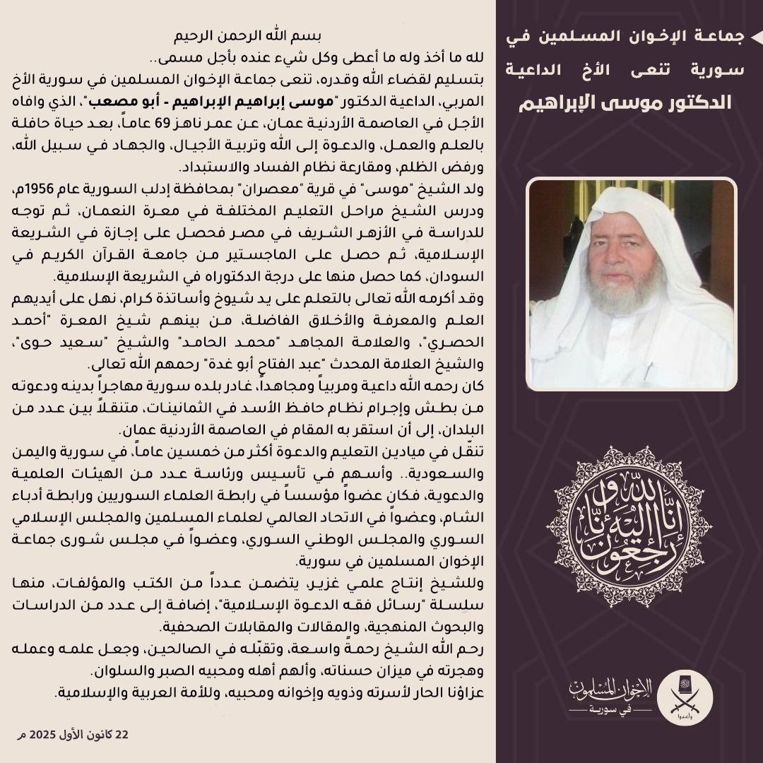 بتسليم لقضاء الله وقدره، تنعى جماعة الإخوان المسلمين في سورية الأخ المربي، الداعية الدكتور “موسى إبراهيم الإبراهيم – أبو مصعب”، الذي وافاه الأجل في العاصمة الأردنية عمان، عن عمر ناهز 69 عاماً، بعد حياة حافلة بالعلم والعمل، والدعوة إلى الله وتربية الأجيال، والجهاد في سبيل الله، ورفض الظلم، ومقارعة نظام الفساد والاستبداد.