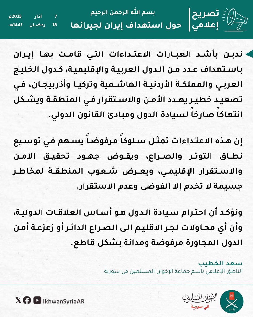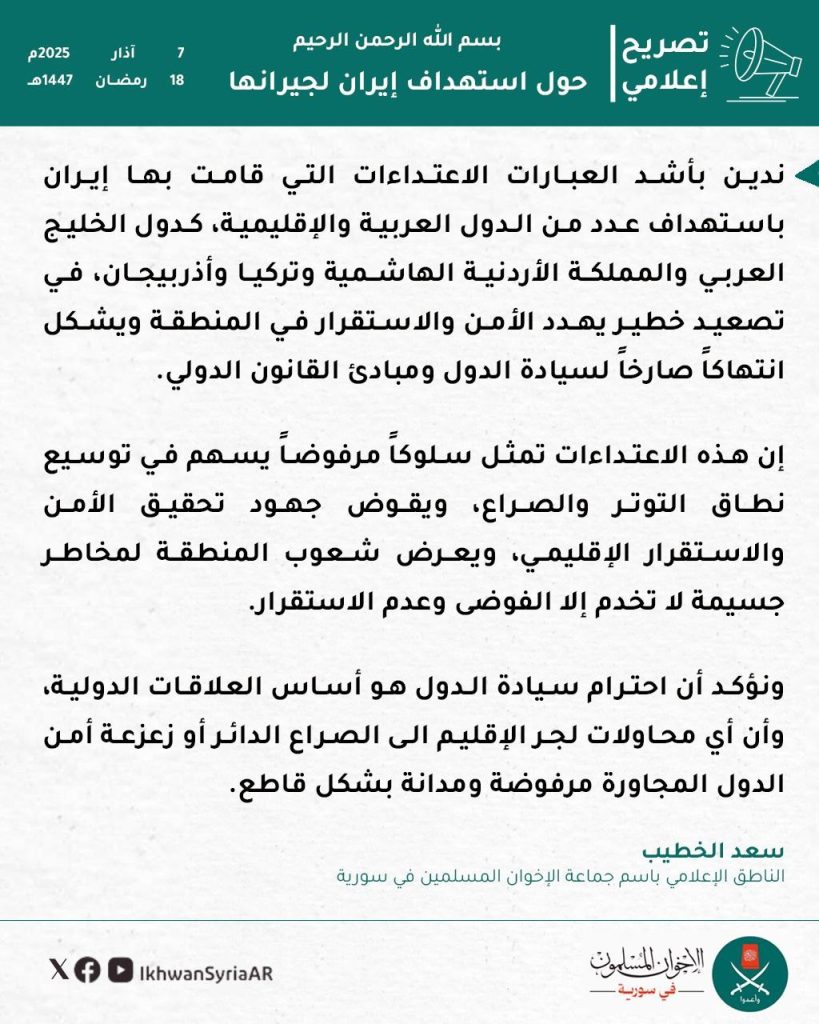 ندين بأشد العبارات الاعتداءات التي قامت بها إيران باستهداف عدد من الدول العربية والإقليمية، كدول الخليج العربي والمملكة الأردنية الهاشمية وتركيا وأذربيجان، في تصعيد خطير يهدد الأمن والاستقرار في المنطقة ويشكل انتهاكاً صارخاً لسيادة الدول ومبادئ القانون الدولي.