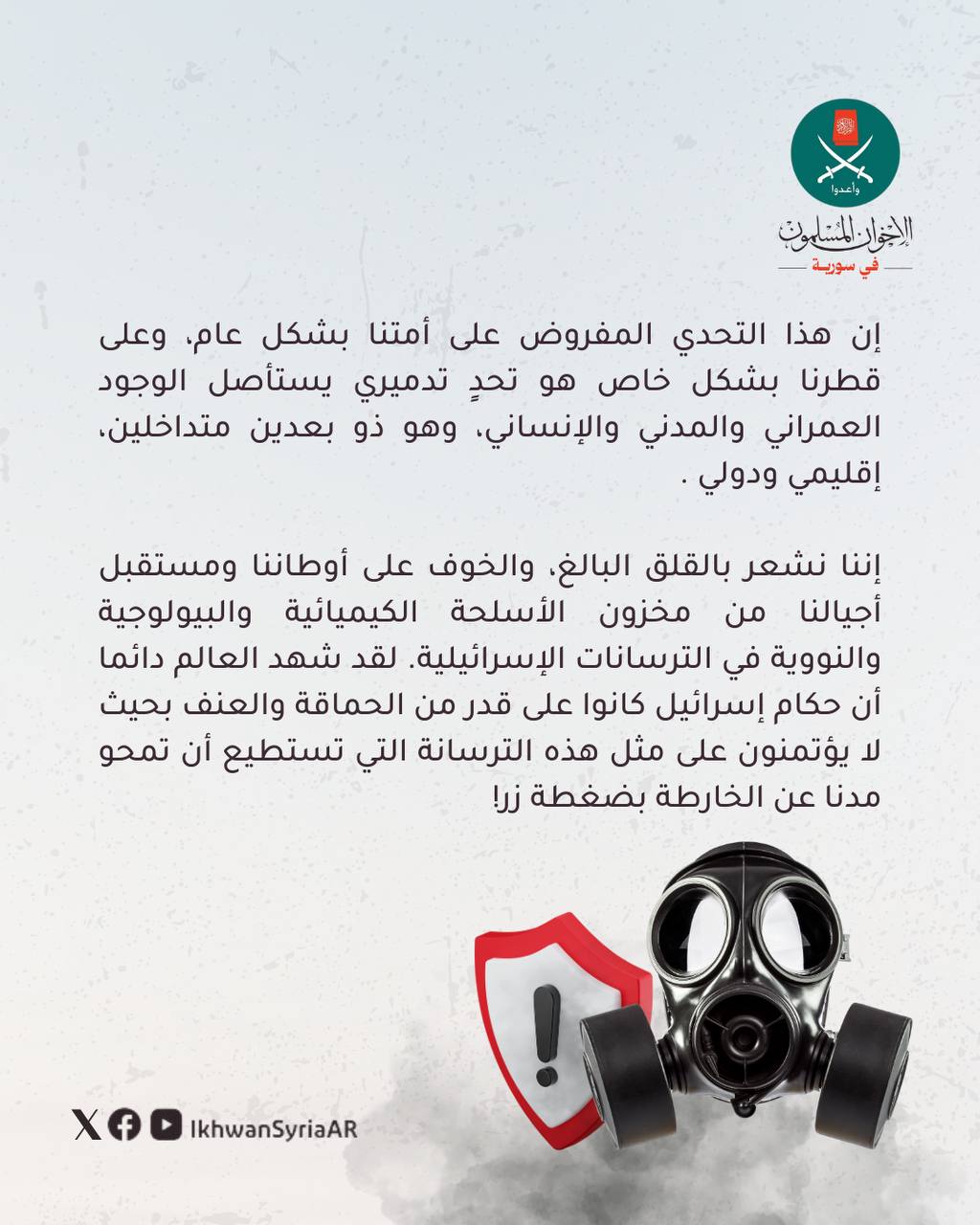 إننا نناشد أحرار العالم ومحبي الخير والإنسانية أن ينضموا إلينا للمطالبة بشرق أوسط نظيف من هذه الأسلحة التي تجسد التحدي الكبير أمام سر الحياة على الأرض، ولن نرضى أن نكون تحت رحمة هذه الأسلحة المدمرة، ومن حقنا الدفاع عن حياتنا ووجودنا أمام هذا الخطر الماحق.