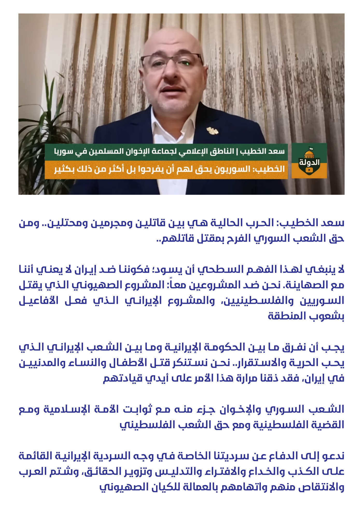 سعد الخطيب: الحرب الحالية هي بين قاتلين ومجرمين ومحتلين.. ومن حق الشعب السوري الفرح بمقتل قاتلهم..