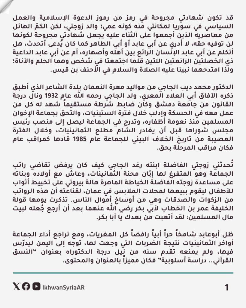 قد تكون شهادتي مجروحة في رمز من رموز الدعوة الإسلامية والعمل السياسي في سورية لمكانتي منه كونه عمي والد زوجتي، لكن الكمّ الهائل من معاصريه الذين أجمعوا على الثناء عليه يجعل شهادتي مجروحة لكونها لن تفيه حقه، لا أدري عن أبي عابد أو أبي الطاهر كما كان يُدعى أتحدث، هل أتكلم عن أبي عابد الإنسان الرائع بين أهله وأصهاره، أم عن أبي عابد الداعية ذي الخصلتين الرائعتين اللتين قلما اجتمعتا في شخص وهما الحلم والأناة؛ ولذا امتدحهما نبينا عليه الصلاة والسلام في الأحنف بن قيس..