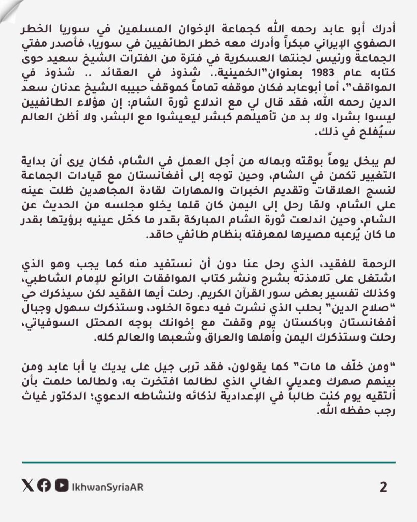 الرحمة للفقيد، الذي رحل عنا دون أن نستفيد منه كما يجب وهو الذي اشتغل على تلامذته بشرح ونشر كتاب الموافقات الرائع للإمام الشاطبي، وكذلك تفسير بعض سور القرآن الكريم، رحلت أيها الفقيد لكن سيذكرك حي صلاح الدين بحلب الذي نشرت فيه دعوة الخلود، وستذكرك سهول وجبال أفغانستان وباكستان يوم وقفت مع إخوانك بوجه المحتل السوفياتي، رحلت وستذكرك اليمن وأهلها والعراق وشعبها والعالم كله..