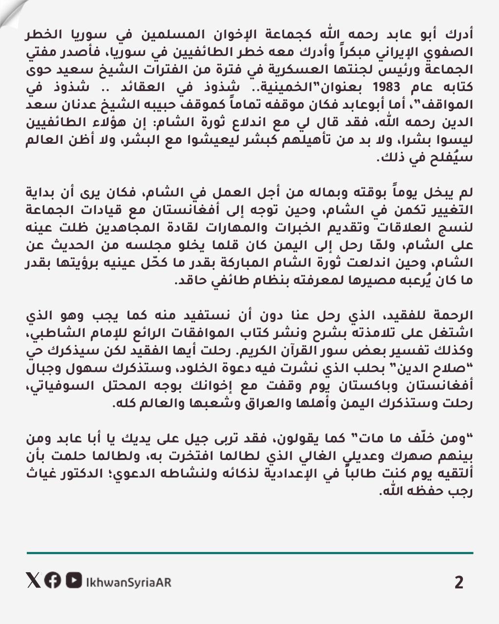 أدرك أبوعابد، رحمه الله، كجماعة الإخوان المسلمين في سورية، الخطر الصفوي الإيراني مبكراً وأدرك معه خطر الطائفيين في سورية، فأصدر مفتي الجماعة ورئيس لجنتها العسكرية في فترة من الفترات الشيخ سعيد حوى كتابه عام 1983 بعنوان”الخمينية.. شذوذ في العقائد شذوذ في المواقف”، أما أبوعابد فكان موقفه تماماً كموقف حبيبه الشيخ عدنان سعد الدين رحمه الله، فقد قال لي مع اندلاع ثورة الشام: إن هؤلاء الطائفيين ليسوا بشرا، ولا بد من تأهيلهم كبشر ليعيشوا مع البشر، ولا أظن العالم سيُفلح في ذلك..