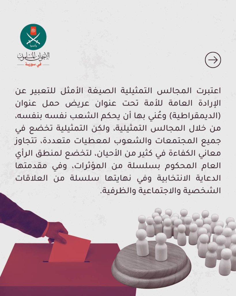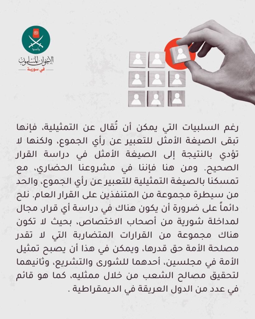 المصدر: المشروع السياسي لسورية المستقبل- رؤية جماعة الإخوان المسلمين في سورية | الباب السادس: السلطة | الفصل الثاني- السلطات الثلاث ومكانتها في بناء الدولة | في فصل السلطات | في معادلة التمثيلية والاختصاص