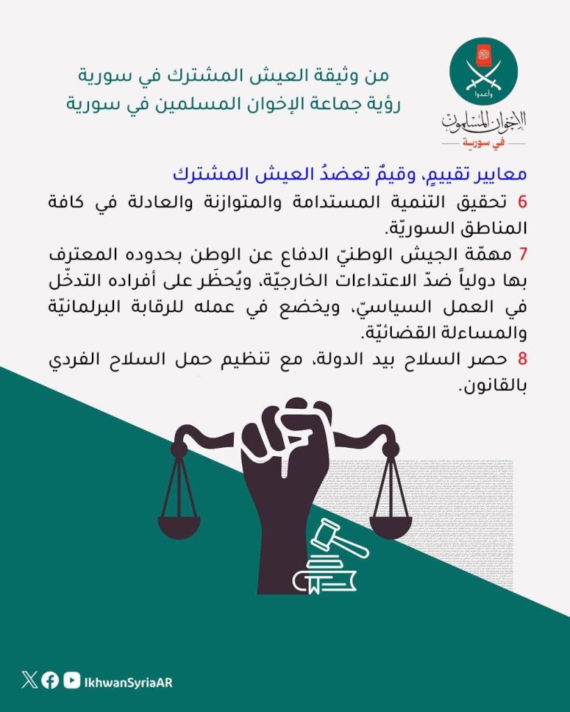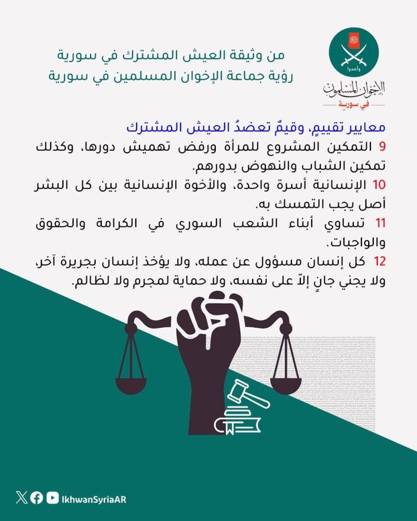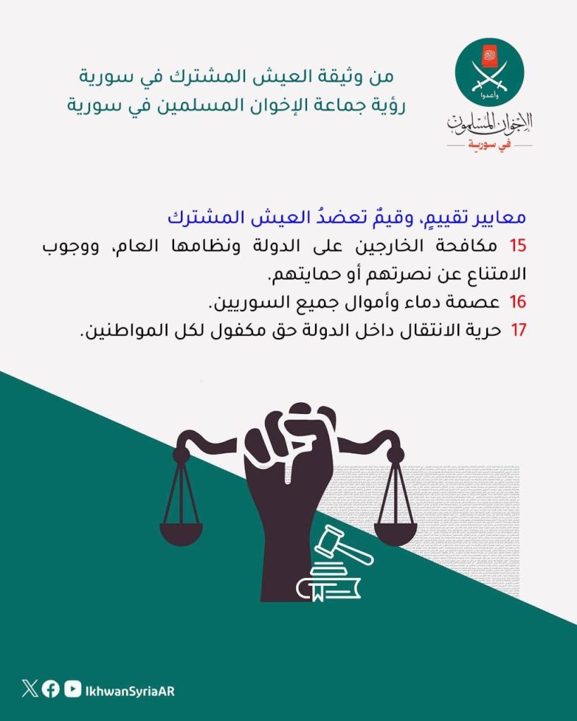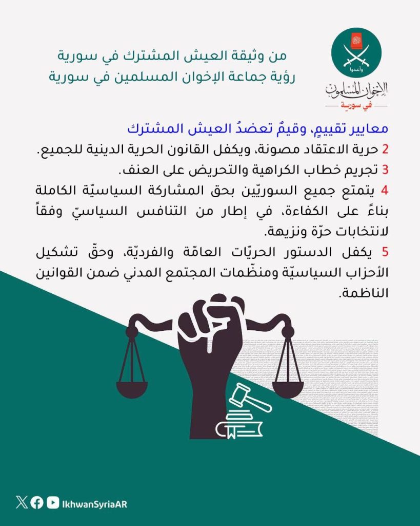 2025 إخوان سورية الأحزاب الإثم الإخوان الإخوان المسلمون الإنسانية الانتخابات الانتخابات الديمقراطية البر البرلمان التداولية التعاون التعددية السياسية التقوى التمرد التنمية الجيش الوطني السوري الحريات الحرية الدينية الحقوق الدستور الدولة الديمقراطية السلاح السياسة الشباب الشريعة الإسلامية الظلم العدوان العلاقات الخارجية العنف العيش المشترك القانون القضاء القيم الكرامة الكراهية الكفاءة المجتمع السوري المجتمع المدني المحاكم الاستثنائية المرأة المشاركة السياسية المعايير المواطنة الواجبات الوثائق الرسمية تداول السلطة تقييم حرمة الدماء حرية الاعتقاد حرية التنقل سلايدر سورية سيادة القانون فصل السلطات وثائق