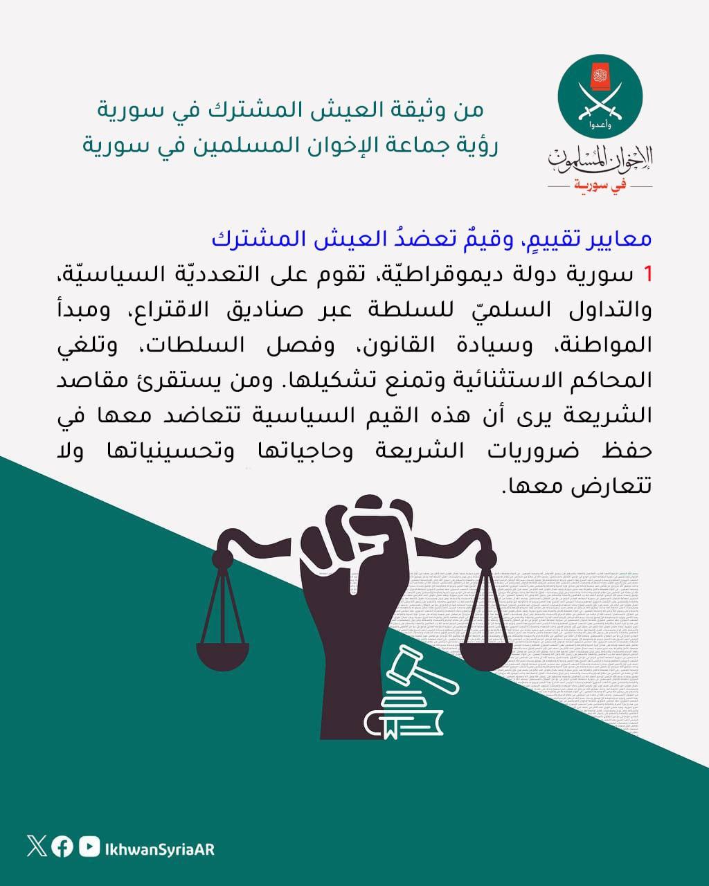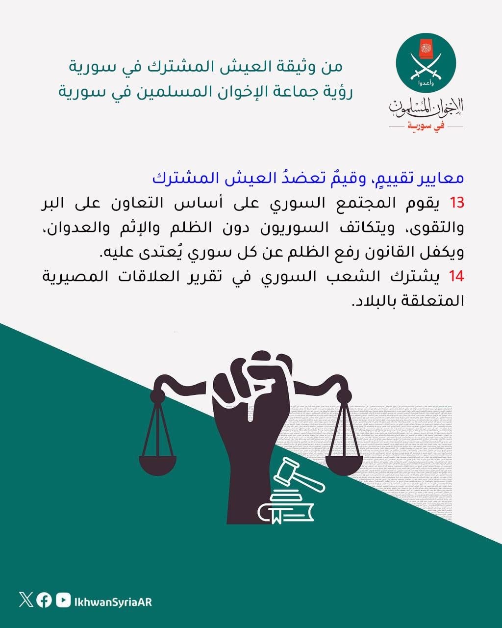 2025 إخوان سورية الأحزاب الإثم الإخوان الإخوان المسلمون الإنسانية الانتخابات الانتخابات الديمقراطية البر البرلمان التداولية التعاون التعددية السياسية التقوى التمرد التنمية الجيش الوطني السوري الحريات الحرية الدينية الحقوق الدستور الدولة الديمقراطية السلاح السياسة الشباب الشريعة الإسلامية الظلم العدوان العلاقات الخارجية العنف العيش المشترك القانون القضاء القيم الكرامة الكراهية الكفاءة المجتمع السوري المجتمع المدني المحاكم الاستثنائية المرأة المشاركة السياسية المعايير المواطنة الواجبات الوثائق الرسمية تداول السلطة تقييم حرمة الدماء حرية الاعتقاد حرية التنقل سلايدر سورية سيادة القانون فصل السلطات وثائق