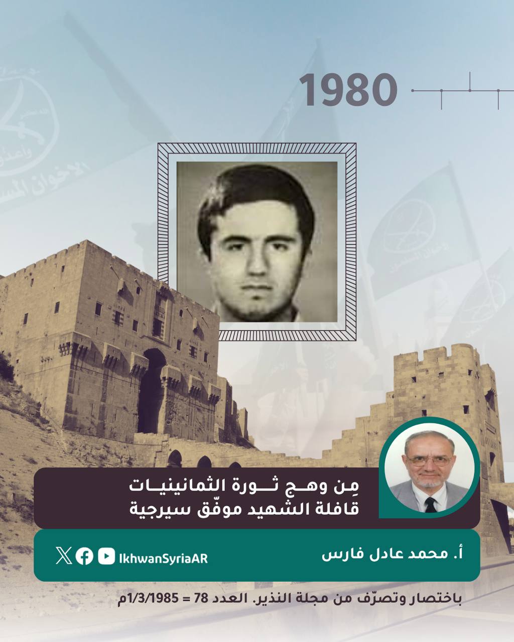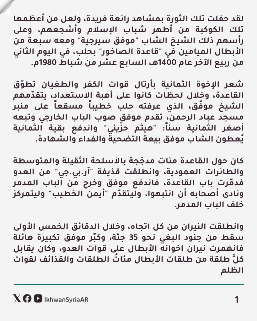 لقد حفلت تلك الثورة بمشاهد رائعة فريدة، ولعل من أعظمها تلك الكوكبة من أطهر شباب الإسلام وأشجعهم، وعلى رأسهم ذلك الشيخ الشاب “موفق سيرجية” ومعه سبعة من الأبطال الميامين في “قاعدة الصاخور” بحلب، في اليوم الثاني من ربيع الآخر عام 1400هـ، السابع عشر من شباط 1980م.