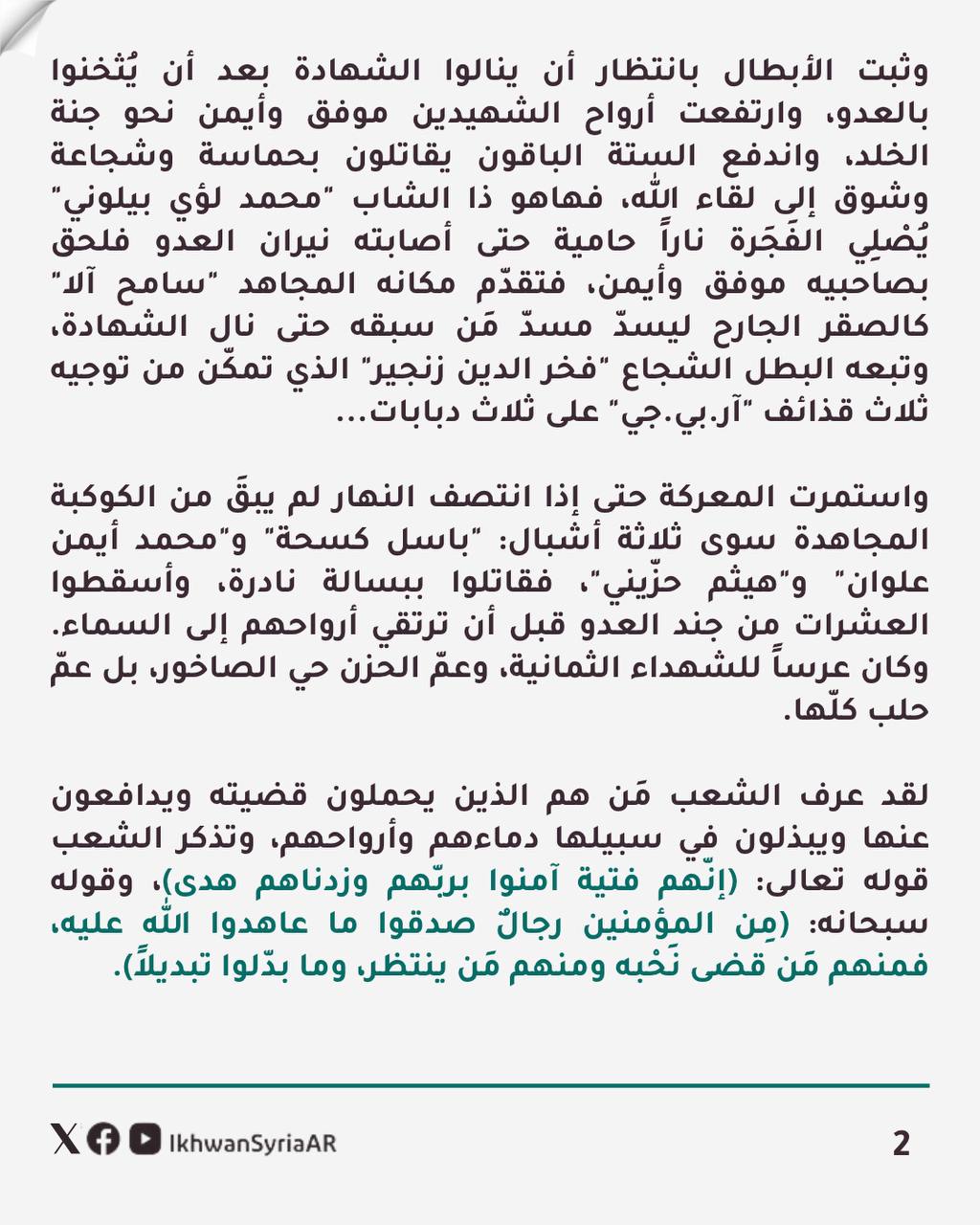 وانطلقت النيران من كل اتجاه، وخلال الدقائق الخمس الأولى سقط من جنود البغي نحو 35 جثة، وكبّر موفق تكبيرة هائلة فانهمرت نيران إخوانه الأبطال على قوات العدو، وكان يقابل كلَّ طلقة من طلقات الأبطال مئاتُ الطلقات والقذائف لقوات الظلم، وثبت الأبطال بانتظار أن ينالوا الشهادة بعد أن يُثخنوا بالعدو، وارتفعت أرواح الشهيدين موفق وأيمن نحو جنة الخلد، واندفع الستة الباقون يقاتلون بحماسة وشجاعة وشوق إلى لقاء الله، فهاهو ذا الشاب “محمد لؤي بيلوني” يُصْلِي الفَجَرة ناراً حامية حتى أصابته نيران العدو فلحق بصاحبيه موفق وأيمن، فتقدّم مكانه المجاهد “سامح آلا” كالصقر الجارح ليسدّ مسدّ مَن سبقه حتى نال الشهادة، وتبعه البطل الشجاع “فخر الدين زنجير” الذي تمكّن من توجيه ثلاث قذائف “آر.بي.جي” على ثلاث دبابات…