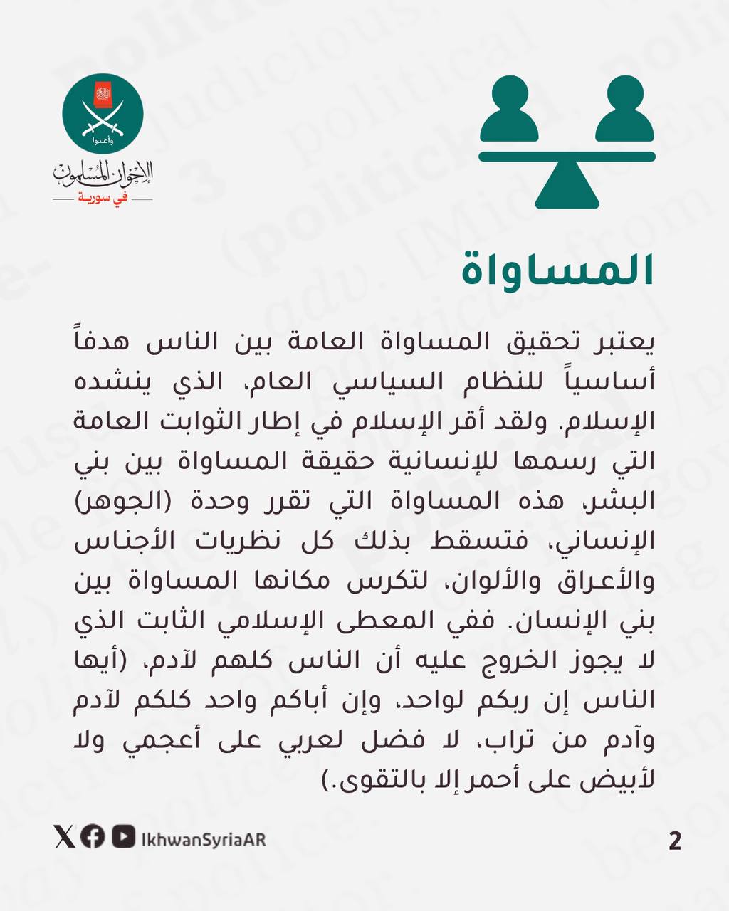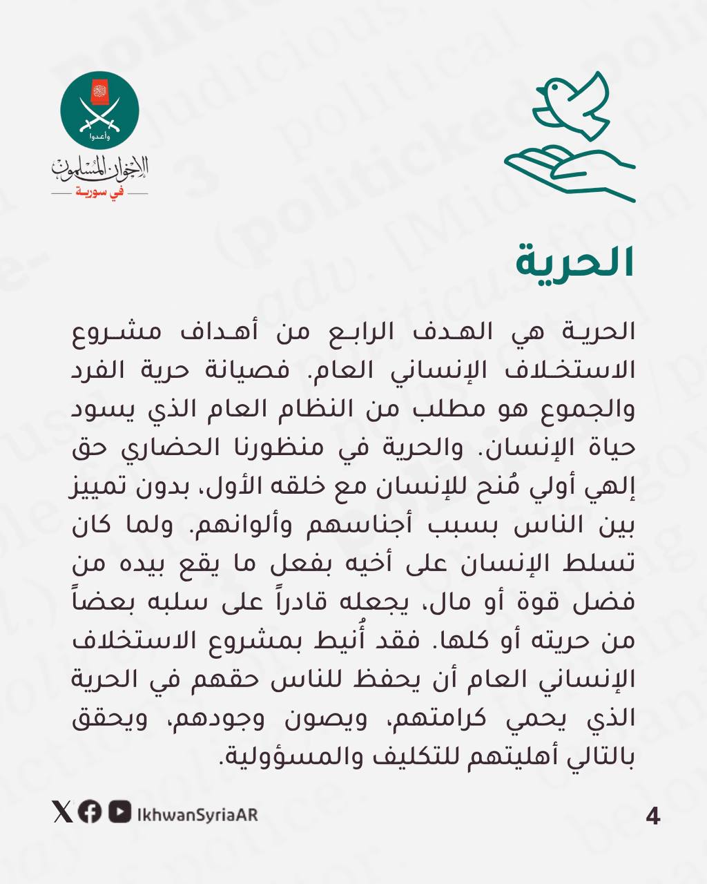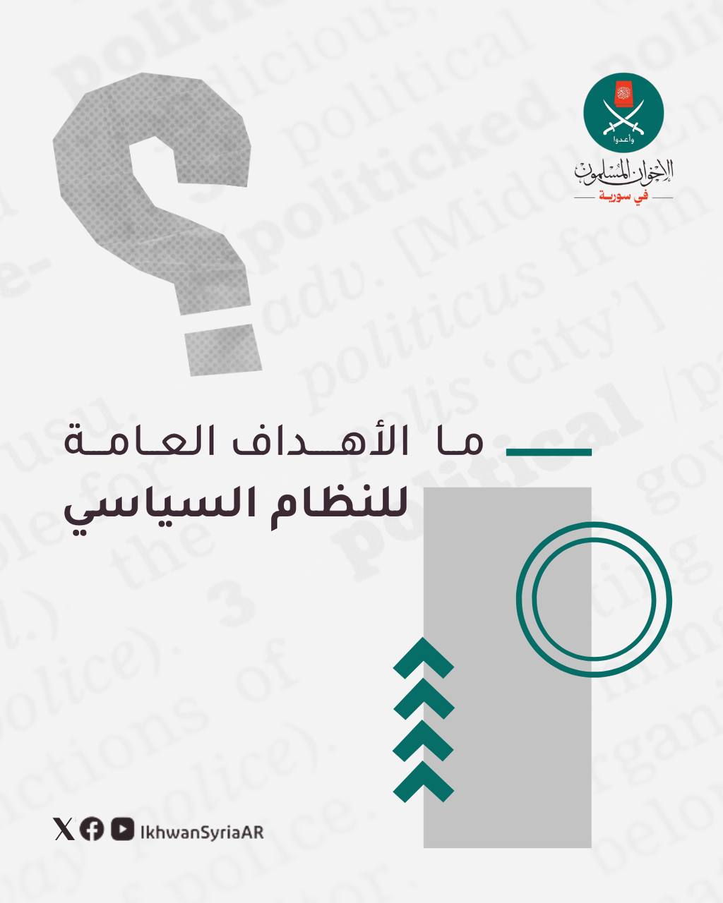 المصدر: المشروع السياسي لسورية المستقبل- رؤية جماعة الإخوان المسلمين في سورية | الجزء الأول: المنطلقات الفكرية والنظرية للمشروع | الباب السابع: في النظم والمناهج | الفصل الثاني: النظام السياسي | ثانيا: الأهداف العامة للنظام السياسي