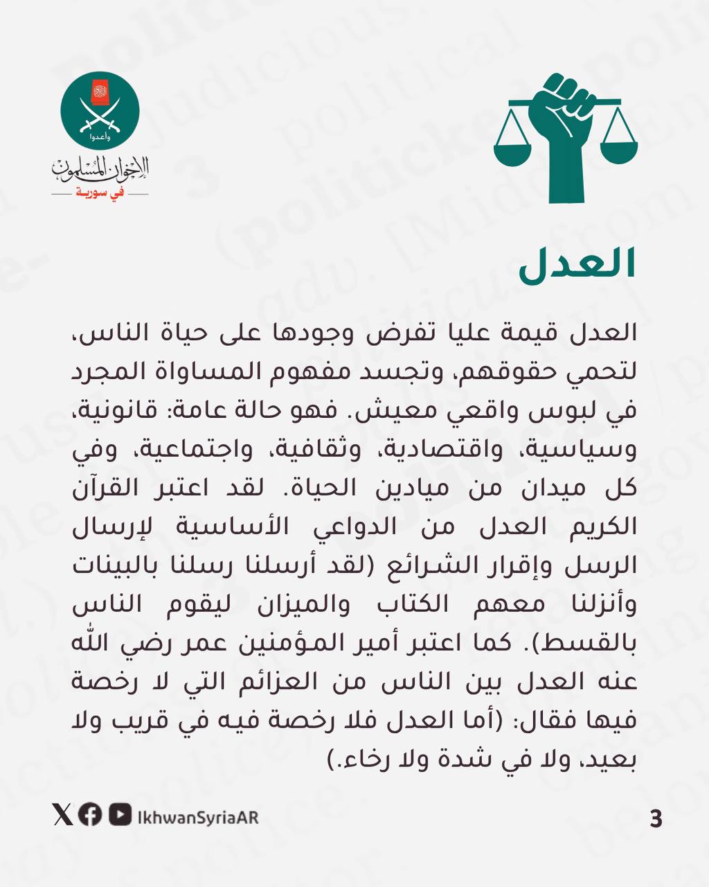 في مشروعنا الحضاري، نعتبر العدل بأبعاده كافة، هدفاً عاماً لمشروع الاستخلاف الإنساني ينبغي أن يتحقق في حياة الناس بأبعاده المادية والمعنوية. فالعدالة في قضاء قاض، كالعدل في فرصة وطنية تصل إلى مستحقها، كالعدل في حظ مواطن من ثروة وطنه.
