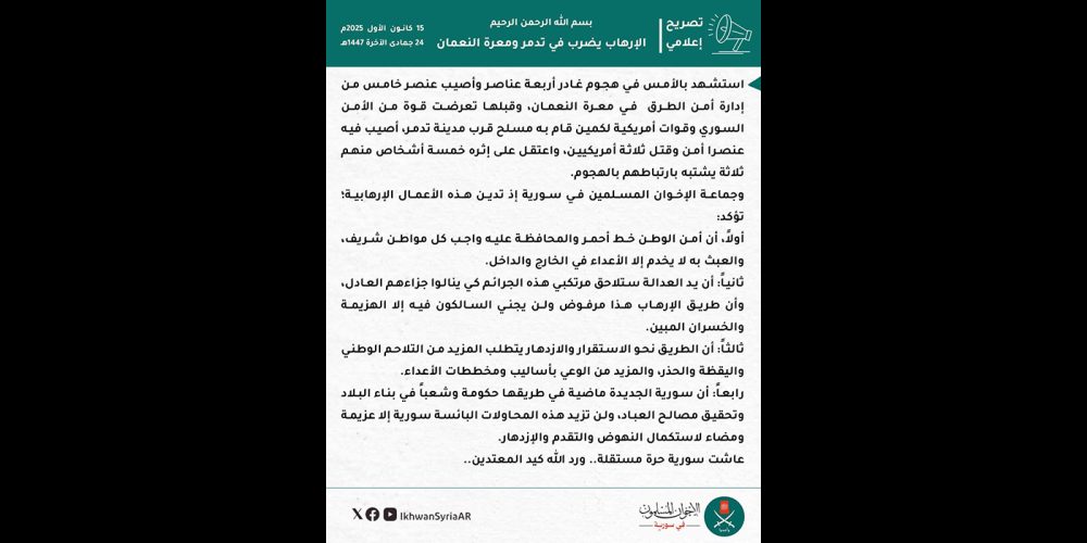 جماعة الإخوان المسلمين في سورية تجدّد وقوفها مع الشعب الفلسطيني وتدعو شرفاء العالم إلى دعمه في قضيته العادلة محرر الموقع20 يوليو، 2025