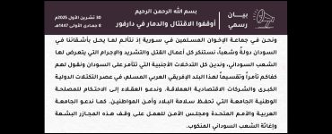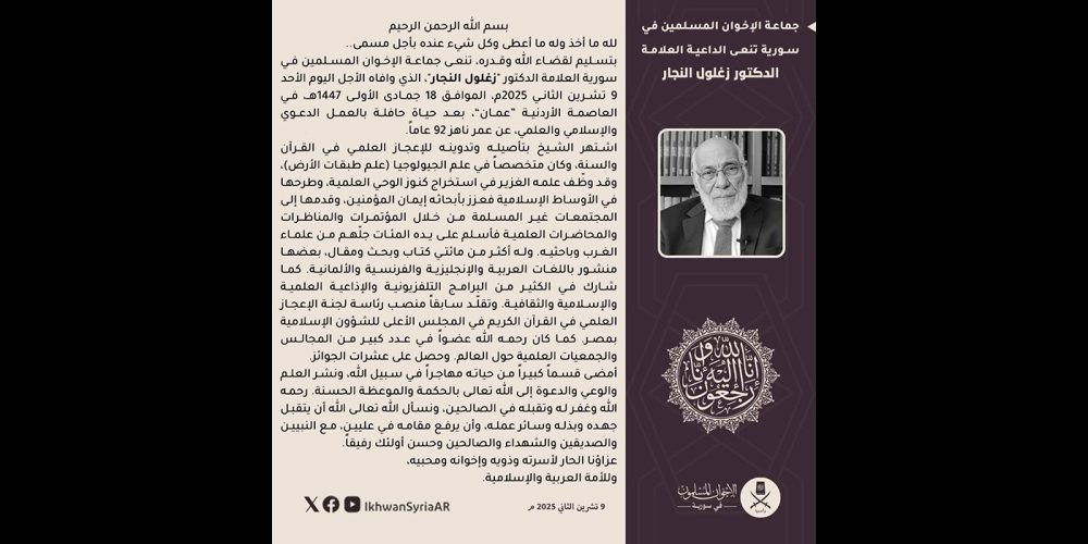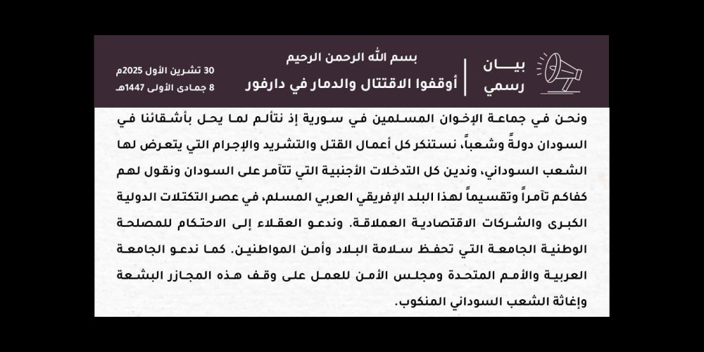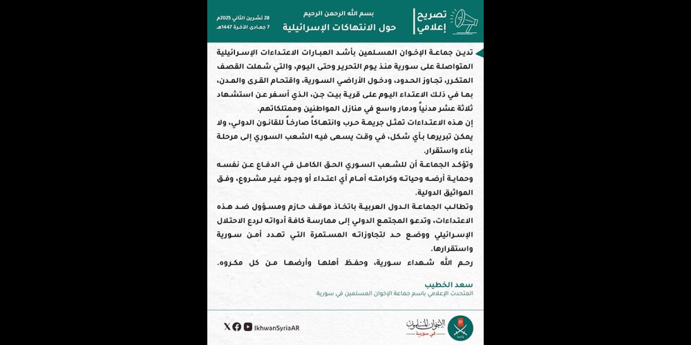 جماعة الإخوان المسلمين في سورية تجدّد وقوفها مع الشعب الفلسطيني وتدعو شرفاء العالم إلى دعمه في قضيته العادلة محرر الموقع20 يوليو، 2025