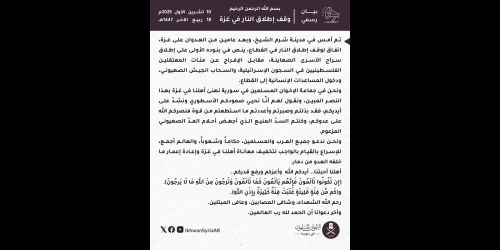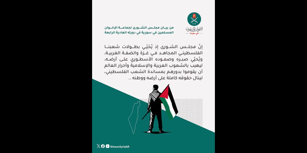 نحيّي بطولات شعبنا الفلسطيني المجاهد في غزة والضفة الغربية.. من بيان مجلس شورى إخوان سورية في دورته العادية الرابعة محرر الموقع8 أكتوبر، 2025