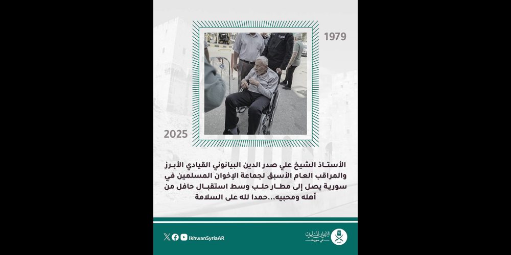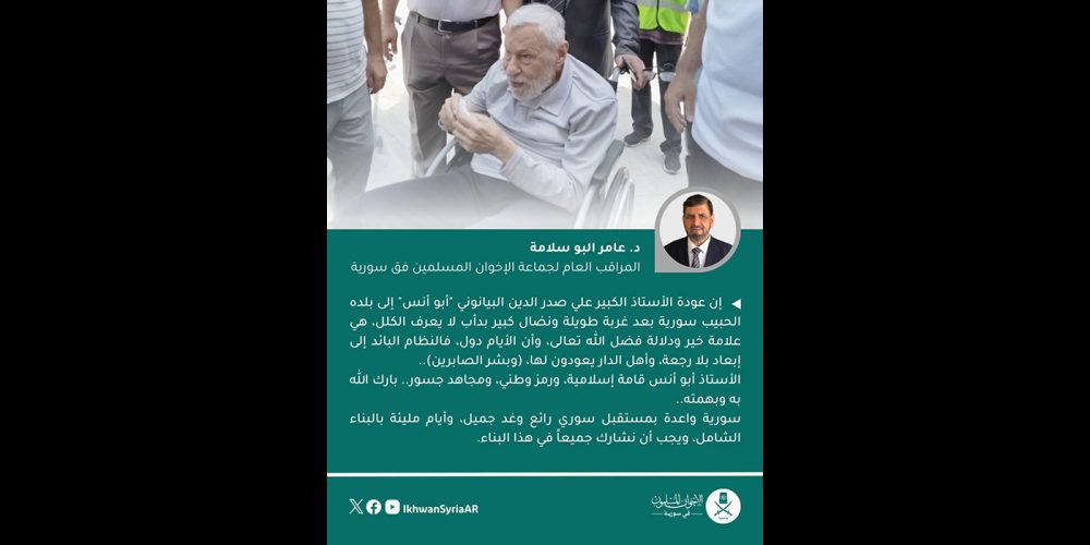 د. “عامر البو سلامة” يشيد بعودة الأستاذ “علي صدر الدين البيانوني” إلى سورية محرر الموقع27 أغسطس، 2025